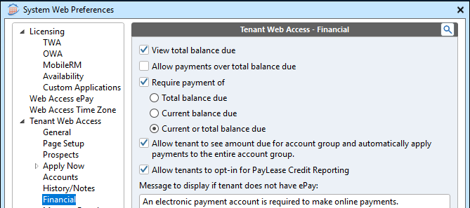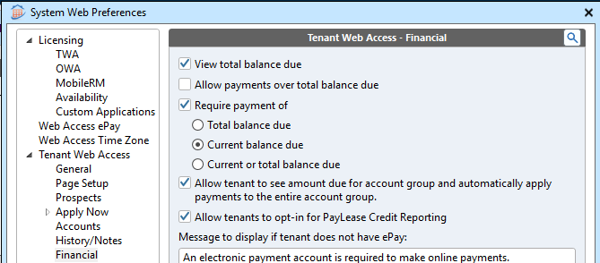 In Rent Manager, navigate to Admin > System Web Preferences > Tenant Web Access > Financial.