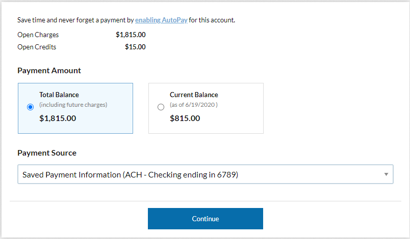 The below configuration requires the tenant to pay either the entire Total Balance (this includes the future charges you may have recently posted) or the entire Current Balance. In the example below, the tenant must pay $1,815 or $815.