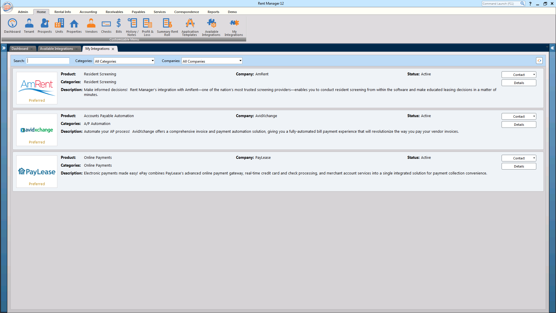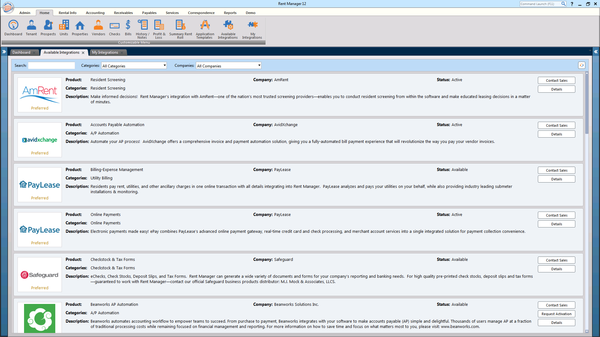 With the Available Integrations Tab, customers can request to have any existing integration activated/deactivated in their RMO setup. This tab allows users to view company information, integration details, or contact their Sales Representative directly from Rent Manager. Integrations can also be sorted by specific technology categories or specific vendor companies. Users are also able to choose which database they would like to set up the integration with, review documentation and required user privileges, and more.
