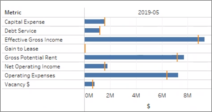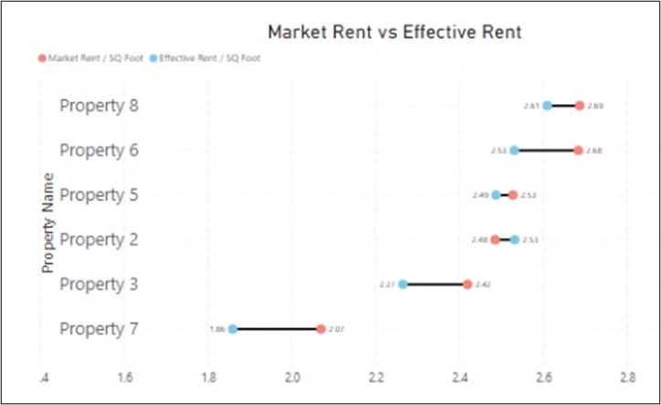 No one wants to leave money on the table by renting below market. By plotting your effective and market rent on a simple chart, you can see the properties that are renting above or below market rent. For each property, the blue dot shows the effective rent per square foot, and the red dot shows the market rent per square foot. The distance between the dots shows the magnitude of difference. When the blue dot is to the left of the red dot, the effective rent is below market.