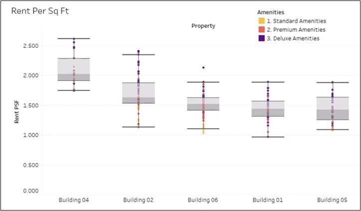 Each dot represents an apartment. This operator categorizes their apartment amenities as Standard, Premium, and Deluxe. The color of the dot shows the amenities of the apartment. As this rent roll shows, some of the Deluxe apartments have a lower rent per square foot than the Standard apartments in each building.