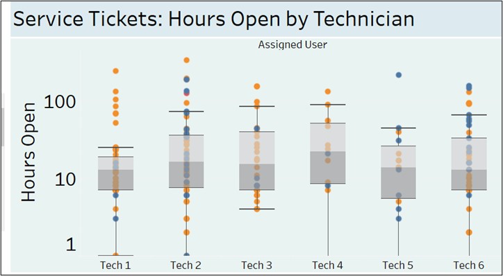 When the goal is to improve response times for closing tickets, it’s helpful to visualize the “spread” of ticket open times, from the shortest to the longest. A “box plot” represents each ticket as a dot, with the vertical position showing how many hours it has been open.