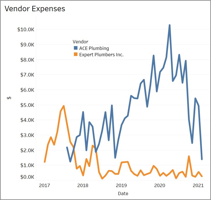 It’s useful to know how much business you are conducting with your vendors, and if the amount has been increasing. A simple line chart can show your payments to two plumbing companies. Such graphs can be very interactive with the application of filters.