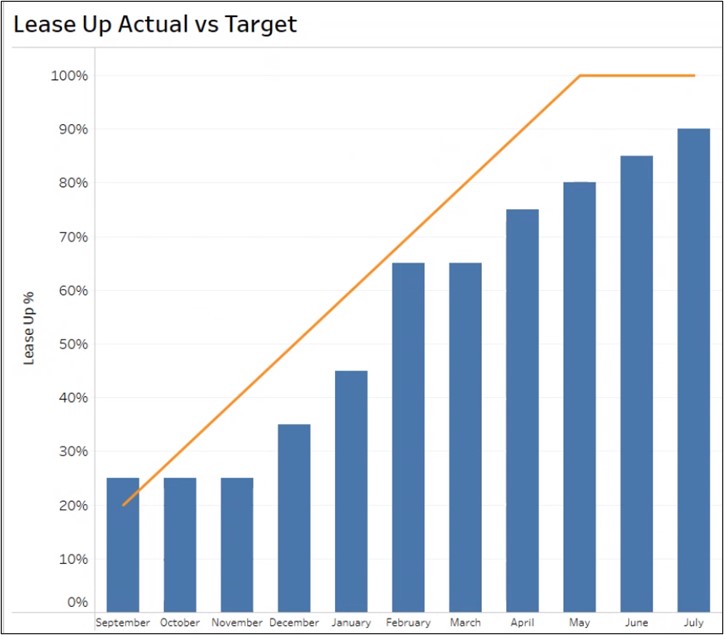 Lease Up is an important metric in student housing that can be viewed with a “combo” chart that uses bars and a line to show progress towards Lease Up goals. The line represents the target while the bar shows the actual Lease Up percent for each month.