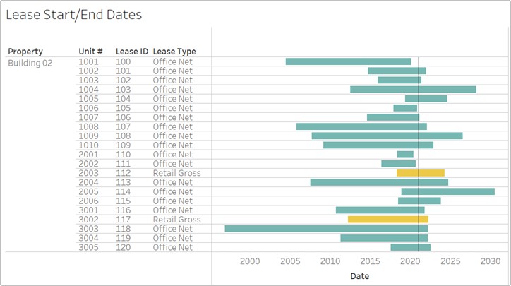To visually display leases that are about to end, you can utilize a Gantt chart. Each horizontal bar represents a lease, starting at the lease start date and extending through the lease end date. The vertical black reference line can be adjusted to your preferred time to show leases ending in its vicinity.