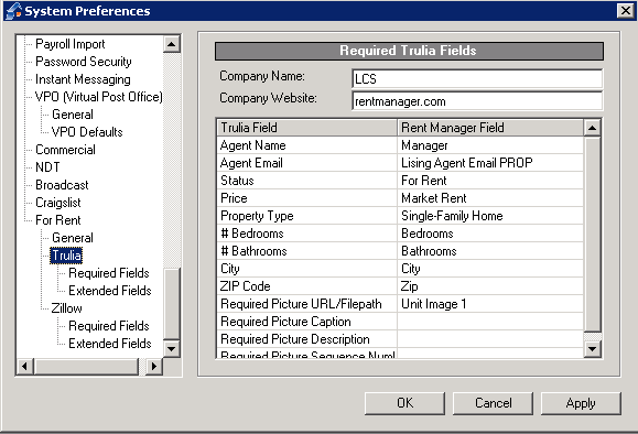 In Rent Manager’s System Preferences, you’ll enable the upload feature for Trulia, determine how units are selected for uploading, and map Rent Manager fields to Trulia fields.- When you apply your System Preferences criteria, Rent Manager will produce a feed list of available units that meet your criteria.