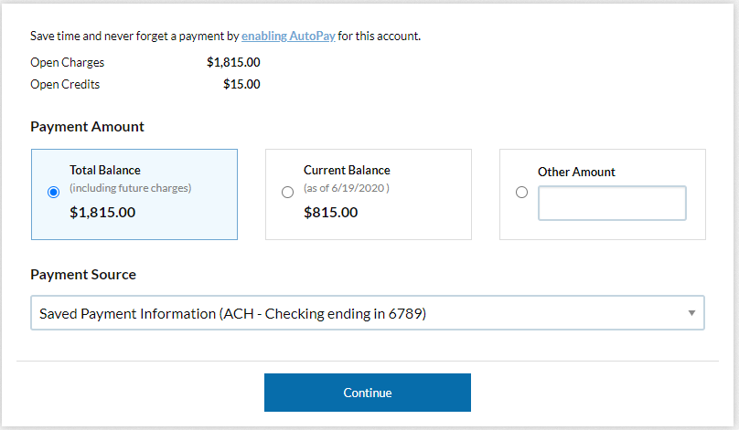 This setup requires the tenant to pay their entire current balance, while simultaneously giving them the option to pay the Total Balance which would include future charges if they wish. In the example below, the Other Amount can be anywhere from $815 to $1,815.