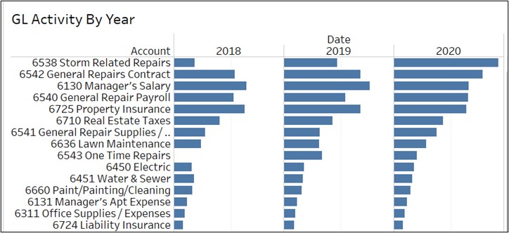 Everyone wants to keep tabs on their expenses, and visually displaying your General Ledger report is a great way to do so. For each expense General Ledger account you have, you can quickly view the total account activity represented in each horizontal bar. Easily identify big expense items, spot increases, and isolate decreases over time.
