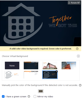 - Be sure to sit in front of a solid color background and avoid wearing similar color clothing for the best results. You can manually select the color to replace in your background by clicking the colored box if it is not automatically detected